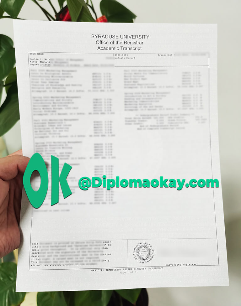 雪城大学(Syracuse University),简称SU,坐落于美国纽约州雪城市,是一所享誉全球的顶尖私立研究型大学。学校始建于1870年,其前身可追溯至1831年由卫理圣公会创立的杰纳西卫斯理神学院,1871年正式迁至雪城并开始授课,1920年转变为无宗派学校,如今已发展成为拥有13个学院、超600个本科及研究生专业的综合性学府。在2026年U.S. News全美大学排名中位列第75位,同时被卡内基高等教育机构分类评为R-1级(最高研究活跃度)博士授予院校,彰显了其强劲的学术实力与科研底蕴。定制雪城大学成绩单,雪城大学成绩单制作,雪城大学毕业证购买,雪城大学成绩单购买,推荐文凭购买公司diplomaokay.com.在线进行高仿雪城大学成绩单,雪城大学假成绩单,美国大学成绩单购买。
