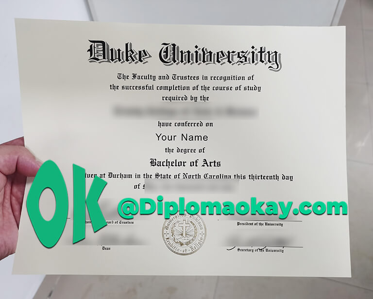 杜克大学(英语:Duke University)坐落于美国北卡罗来纳州达勒姆市,是一所享誉全球的私立综合研究型大学,素有“南方常春藤”的美誉。其历史可追溯至1838年,最初是由循道宗和贵格会信徒创办的小型院校,历经师范学院、三一学院等阶段,1924年因烟草大亨詹姆斯·杜克的巨额捐赠正式更名。如今,杜克大学已发展为占地8693英亩、拥有4个校区的学术重镇,在校学生超1.7万人,教职工4200余人,其中不乏诺贝尔奖、普利策奖得主等顶尖学者。2026年,该校在QS世界大学排名中位列第62位,泰晤士高等教育世界大学排名第28位,U.S. News世界大学排名第27位,学术实力得到全球认可。购买杜克大学文凭,杜克大学毕业证制作,杜克大学毕业证定制,杜克大学学位定制,推荐文凭购买公司diplomaokay.com.在线进行高仿杜克大学文凭,杜克大学假学历,美国大学文凭购买。