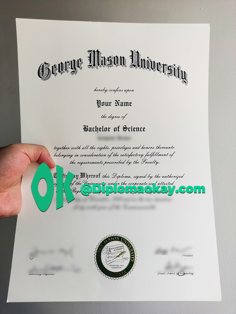 以上描述论断完全代表本站《毕业证办理机构》diplomaokay.com的观点和立场,本文任何内容不得转载或用于商业目的。如有任何描述或见解存在瑕疵或需要补充,我将感激指正。面临留学挂科、中途退学、成绩分数不理想等问题,欢迎随时与我们交流,本站所有案例均为真实原版,如需查看高清实物效果图,请联系客服。GMU毕业证购买,推荐美国毕业证购买机构。买大学毕业证、买大学成绩单、修改成绩单分数、文凭复刻、假文凭制作、假成绩单制作、大学录取通知书、Studentcard、雅思成绩单、托福成绩单等材料,不论是遗失补办还是证件破损,都可以找我们1:1复制。很多升学或求职单位需要提供经过认证的学历资料,我们也可以协助处理。同时办理留信认证,海牙认证也是我们的主要业务范围。针对那些无法提供正式毕业证的申请人,我们提供全套材料办理。如需加急处理,请提前告知,正常情况需要5个工作日左右完成订单,加急处理通常会在24小时之内完成并且邮寄。急客户之所急,为客户提供良好的售前和售后服务,也是本机构一贯的宗旨。