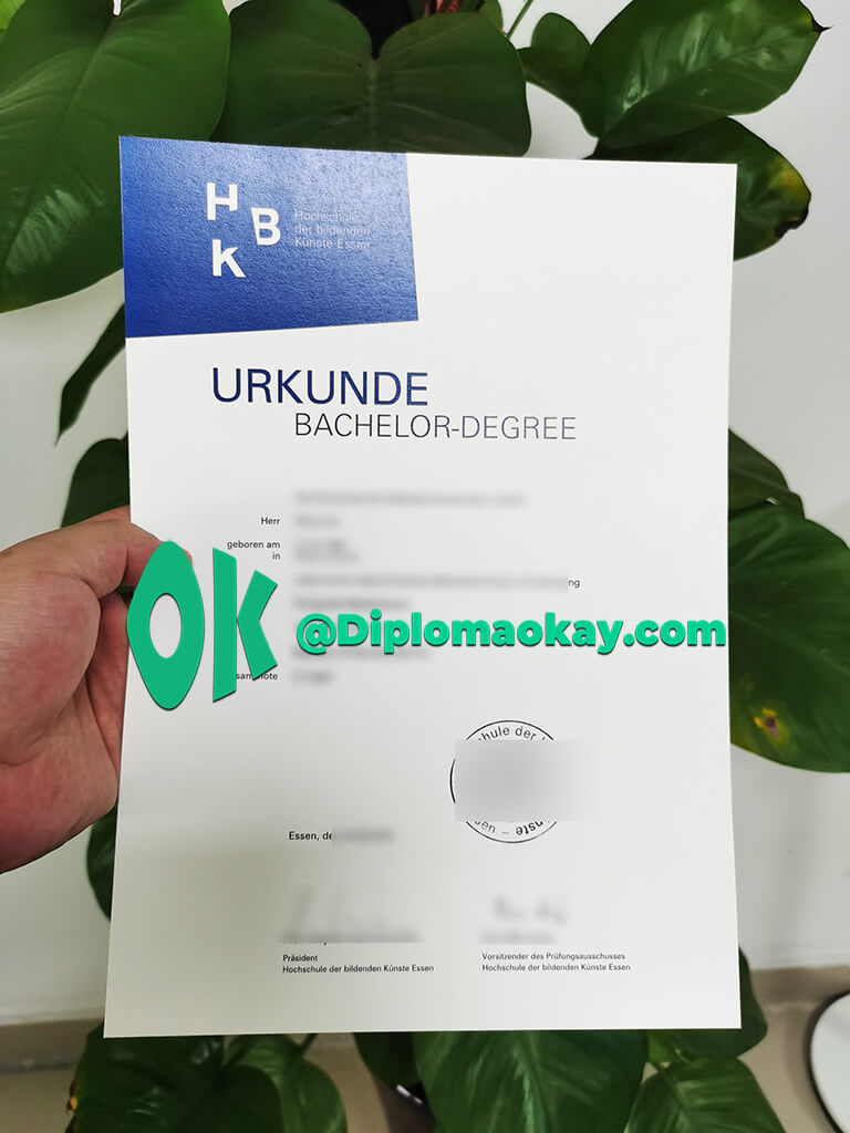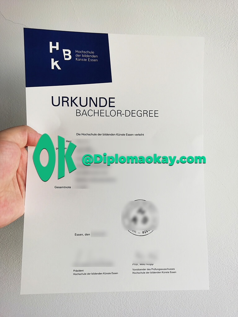 HBK Essen文凭购买,埃森造型艺术学院毕业证购买,埃森造型艺术学院毕业证定制,办理HBK Essen文凭,埃森造型艺术学院学位定制,推荐文凭购买公司diplomaokay.com.在线进行高仿埃森造型艺术学院文凭,埃森造型艺术学院假学历,德国大学文凭购买。埃森造型艺术学院(Hochschule der bildenden Künste Essen,简称HBK Essen)是德国一所备受认可的艺术与设计类院校,成立于2001年,位于北莱茵-威斯特法伦州的埃森市,是一所私立但获得中德教育部双重认证的学院。学校以艺术与设计学科为核心,提供绘画、摄影/媒体艺术、雕塑、产品设计、数字媒体设计、游戏艺术与设计等本科专业,以及艺术管理硕士课程。HBK Essen采用小班教学模式,强调跨学科艺术实践与理论研究的结合,地处鲁尔区中心,毗邻红点设计博物馆,为学生提供了丰富的艺术资源和学习环境。此外,学校还设有国际预科课程,涵盖专业与语言培训,并与佛山科学技术学院开展“3+1”双学位联合培养项目。作为德国大学校长会议成员,HBK Essen在欧洲艺术教育领域具有重要影响力。