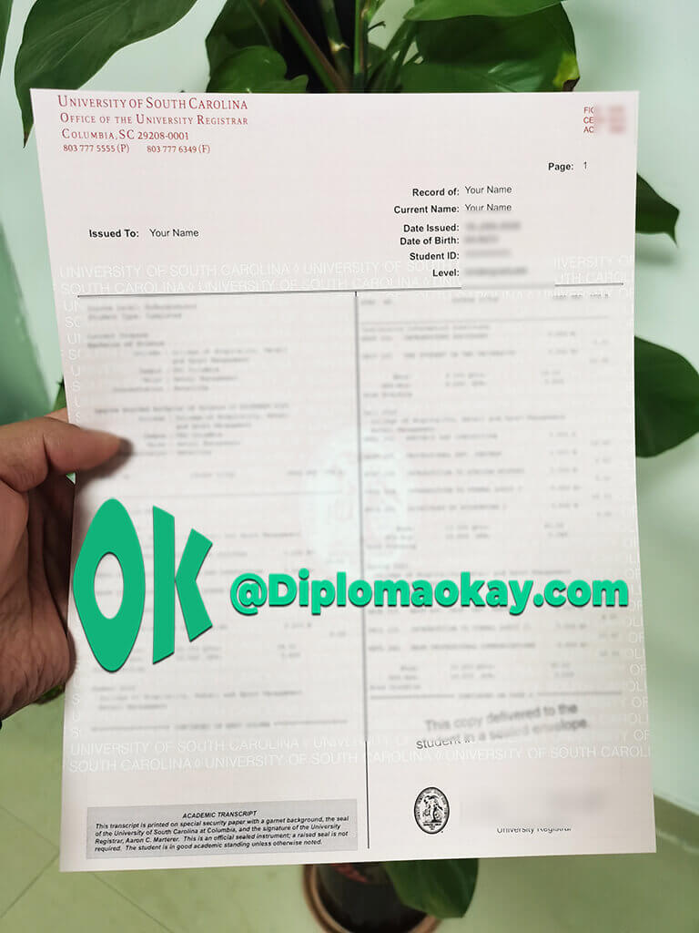 南卡罗来纳大学(University of South Carolina,简称USC)创立于1801年,是美国历史最悠久的公立大学之一,也是南卡罗来纳大学系统的旗舰院校。学校最初名为南卡罗来纳学院,由时任州长约翰·德雷顿推动建立,旨在提升当地人文教育水平。经过两个多世纪的发展,如今的南卡罗来纳大学已拥有8个校区,分布在全州20个地点,在校生总数超55000人,主校区位于南卡罗来纳州首府哥伦比亚市,这里既是州内政治经济中心,也是全美发展速度最快的城市之一,为学生提供了丰富的实习、就业与生活资源。定制南卡罗来纳大学成绩单,南卡罗来纳大学成绩单制作,南卡罗来纳大学毕业证购买,南卡罗来纳大学成绩单复刻,推荐文凭购买公司diplomaokay.com.在线进行高仿南卡罗来纳大学成绩单,南卡罗来纳大学假成绩单,美国大学成绩单购买。