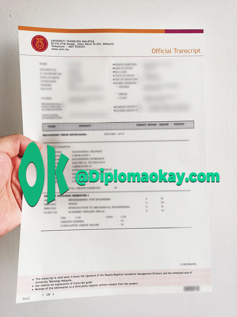 定制UTM成绩单,马来西亚理工大学成绩单购买,UTM成绩单购买,马来西亚理工大学成绩单复刻,推荐文凭购买公司diplomaokay.com.在线进行高仿UTM成绩单,马来西亚理工大学假成绩单,马来西亚大学成绩单购买。马来西亚理工大学(Universiti Teknologi Malaysia, UTM)是一所享有盛誉的高等学府,成立于1972年,位于马来西亚南部的柔佛州。作为马来西亚首屈一指的技术大学之一,UTM以其卓越的工程和科技教育而闻名,并积极致力于研究与创新。校园内的设施现代化,包括先进的实验室、图书馆及学习空间,为学生提供了良好的学习环境。UTM开设多种本科和研究生课程,涵盖工程、科技、建筑、环境科学等多个领域。学校与国际知名大学合作,推动学生的全球视野与专业培养。